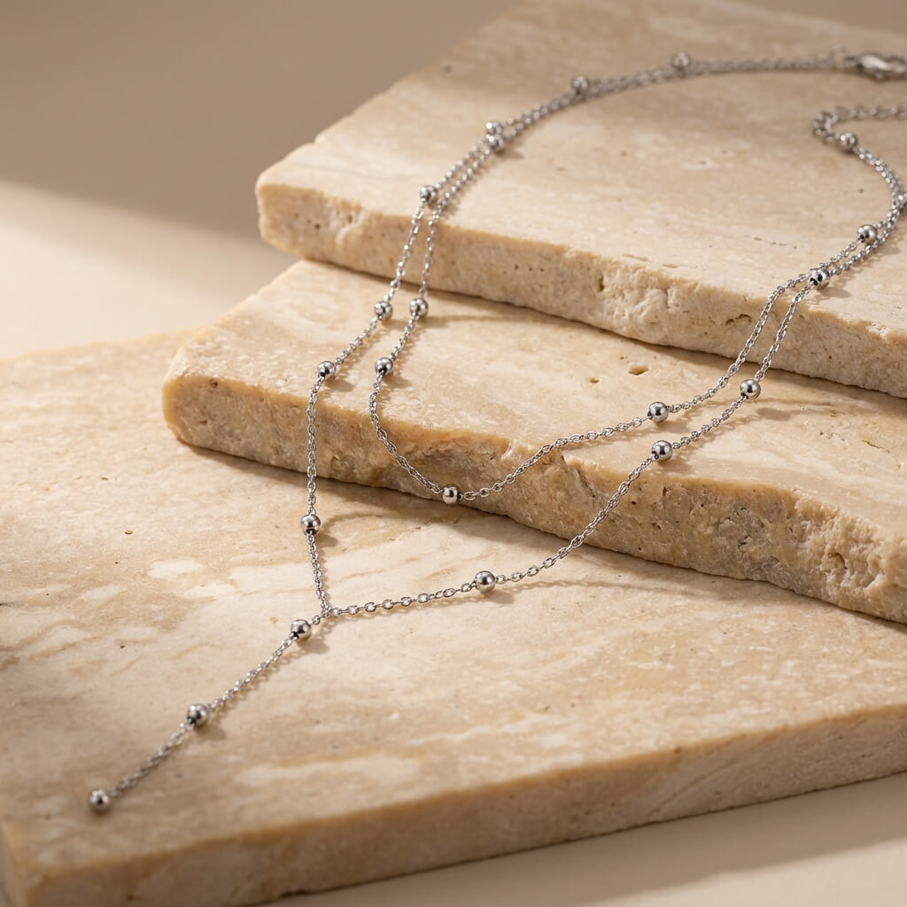 Ce collier double rang en Y séduit par son éclat argenté et sa ligne délicate. Les petites perles réparties sur la chaîne apportent rythme et légèreté au décolleté. Sa superposition subtile crée un effet élégant sans surcharge. Une pièce moderne, facile à porter au quotidien.
