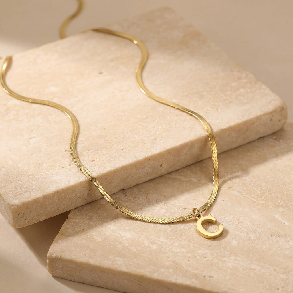 Ce collier met en valeur une initiale élégante montée sur une chaîne serpent au rendu lisse et moderne. Sa ligne plate épouse délicatement le cou pour un effet chic et soigné. La finition dorée illumine la tenue avec subtilité. Un bijou personnel, facile à porter au quotidien.
