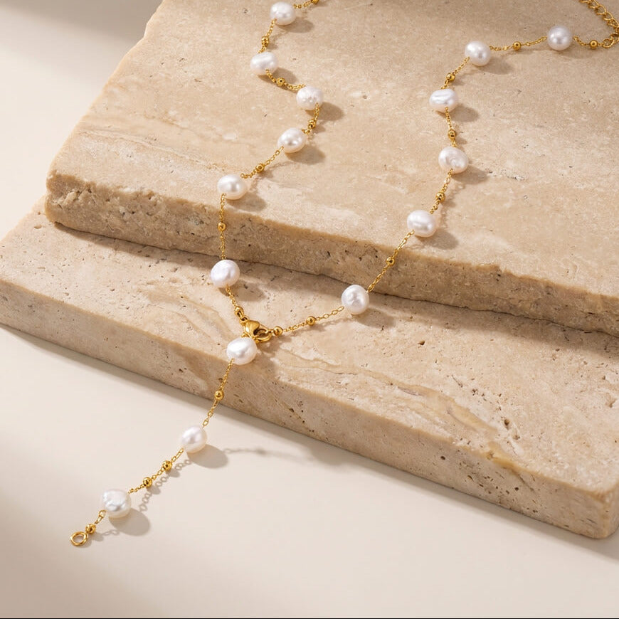 • Design : Chaîne fine ornée de perles nacrées avec chute centrale