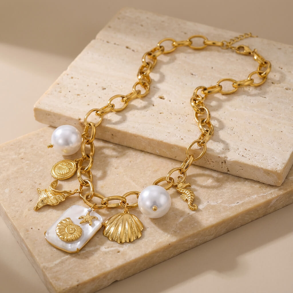Ce collier capte immédiatement le regard grâce à son inspiration océan raffinée. Il rehausse une tenue simple en apportant une note lumineuse et féminine.
