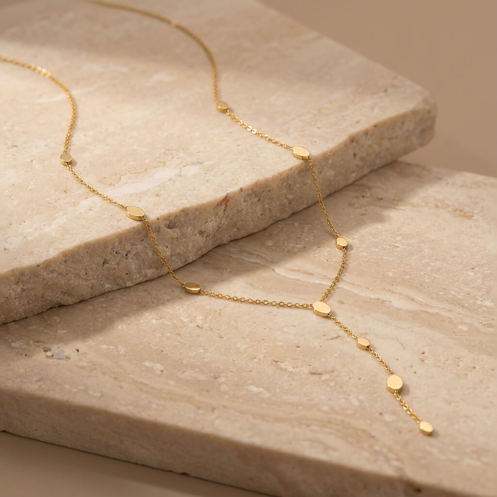 La forme en Y attire naturellement le regard vers le centre du buste. Ce collier accompagne aussi bien une tenue minimaliste qu’un look plus habillé.